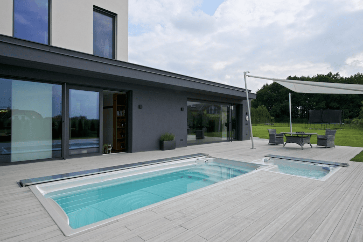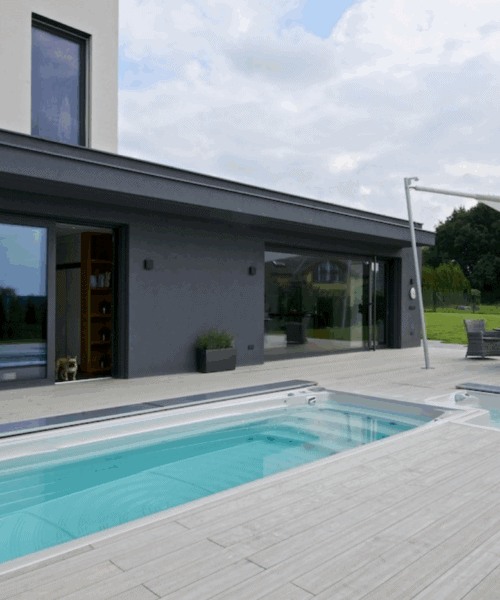 USSPA swim spa leveres med tre forskellige typer covers - manuelt, mekanisk og automatisk coversystem. Det automatiske og patenterede swim spa cover glider let og elegant over swim spaen ved et tryk på en knap. Og når poolen skal bruges, forsvinder coveret ned i terrassen, som et brev i brevsprækken.